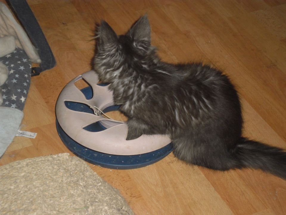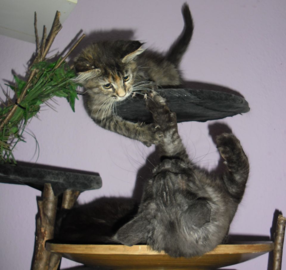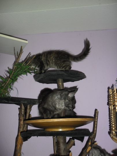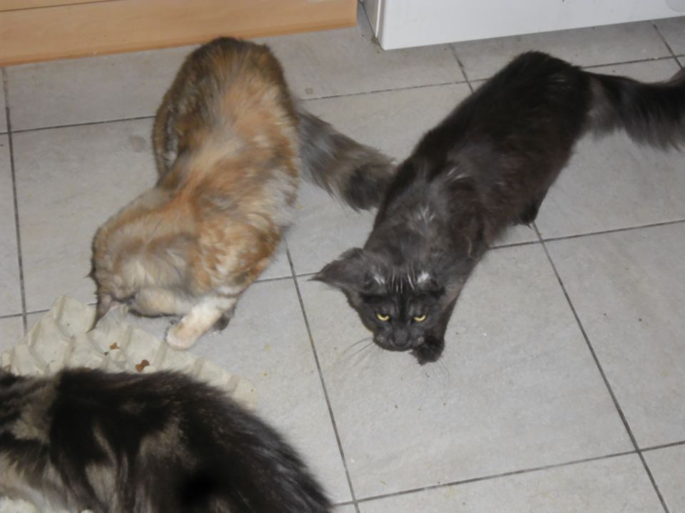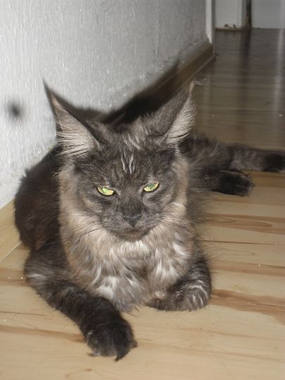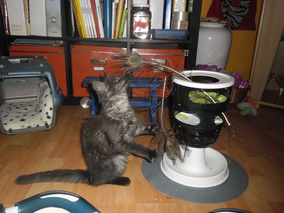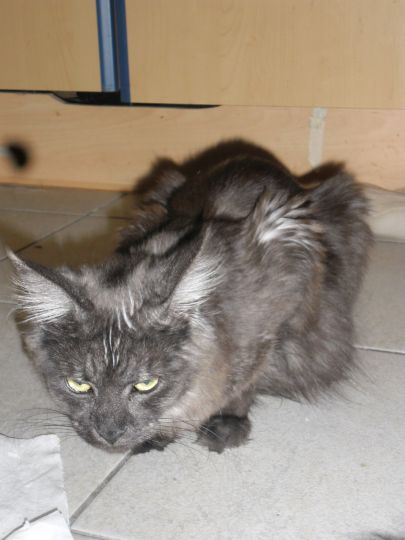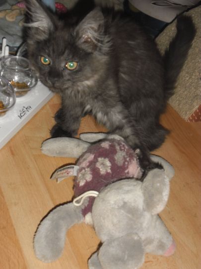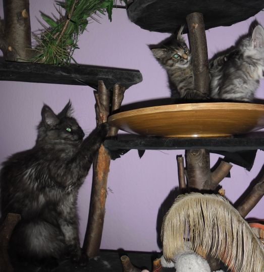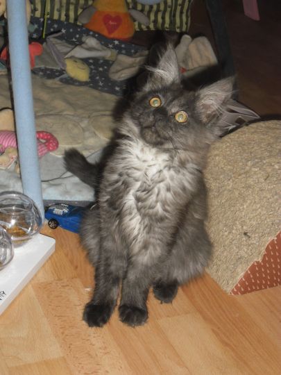 Sie ist schwärzer als ihr Schatten. Das dunkle Gesicht und die bernsteingelben Augen lassen sie so Eulenhaft wirken wie sonst nur eine echte Eule sein kann. Sie entwickelt sich prächtig, wird von Tag zu Tag schöner und silbriger. Danke Susi, dass du uns diese Prachtkatze überlassen hast. Wir beobachten gespannt ihre weitere Entwicklung.
