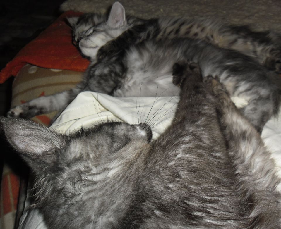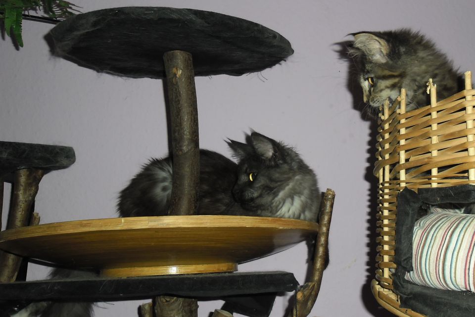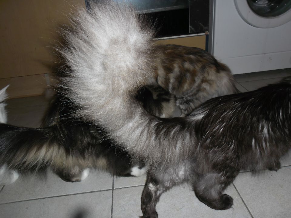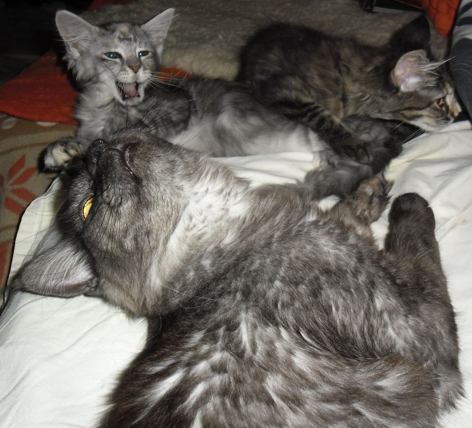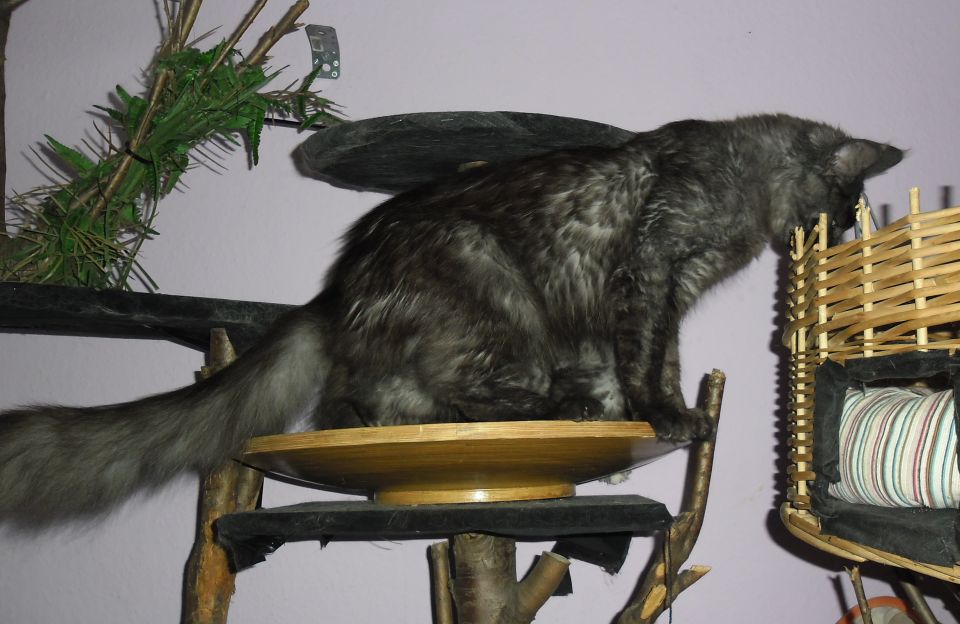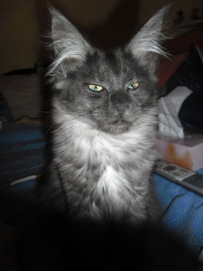 Sie ist schwärzer als ihr Schatten. Das dunkle Gesicht und die bernsteingelben Augen lassen sie so Eulenhaft wirken wie sonst nur eine echte Eule sein kann. Sie entwickelt sich prächtig, wird von Tag zu Tag schöner und silbriger. Danke Susi, dass du uns diese Prachtkatze überlassen hast. Wir beobachten gespannt ihre weitere Entwicklung.